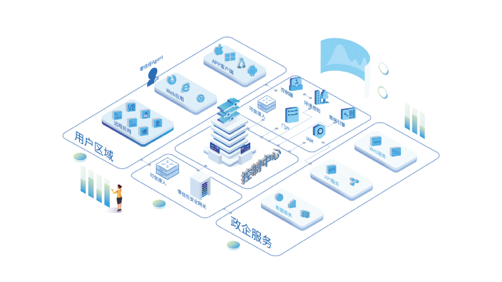 基于零信任“持续验证,永不信任”的安全理念,围绕身份为中心,以最小授权、持续认证、动态访问控制、服务隔离为链条,多维信任评估算法为基础,为政企应用提供统一、安全、高效的访问入口,保障数据安全。