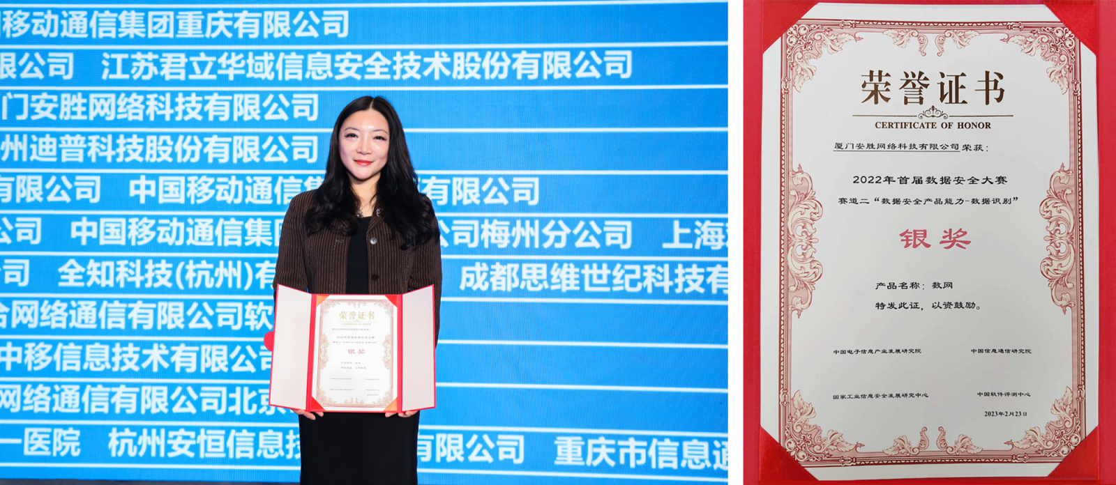 2月23日,由工业和信息化部、四川省人民政府主办,中国信息通信研究院牵头承办的2023年中国网络和数据安全产业高峰论坛在成都召开。会议现场正式公布了2022年首届数据安全大赛的获奖名单并举行了颁奖仪式,其中安胜凭借“数网”数据资产梳理与数据库扫描系统荣获2022年首届数据安全大赛赛道二“数据安全产品能力-数据识别”银奖!