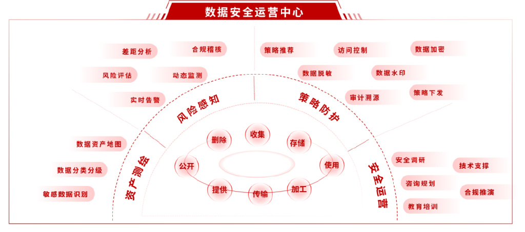 并且从管理体系保障、数据安全评估、安全策略规划、数据安全防护、数据安全运营五个阶段,以服务和产品相结合的模式,为政府和企业提供数据安全咨询、安全建设到安全运营的一体化解决方案,解决客户数据安全及合规问题。