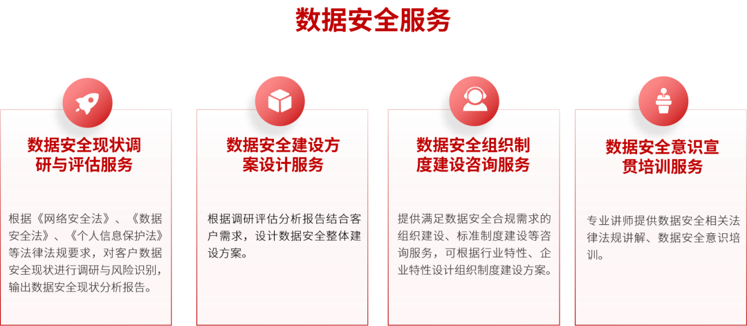 覆盖数据治理全生命周期的数据安全系列产品,包括数据资产分类分级、数据脱敏、数据加密、数据库审计、数据库防火墙、数据库运维安全防护、终端数据防泄漏、数据销毁等多款产品。