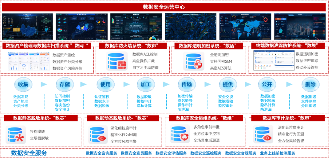 安胜依托多年在大数据领域、网络空间安全的优势,推出了数据安全全生命周期解决方案,以“服务+产品”的模式,为客户提供全方位的数据安全咨询、安全建设和安全运营解决方案。产品体系包括数据资产分类分级、数据脱敏、数据加密、数据库审计、数据库防火墙、数据库运维安全防护、终端数据防泄漏、数据销毁等多款产品和服务。尤其是数据安全运营中心涵盖了资产测绘、风险感知、策略编排、联防联控等核心功能,为客户提供全面的数据安全保障。