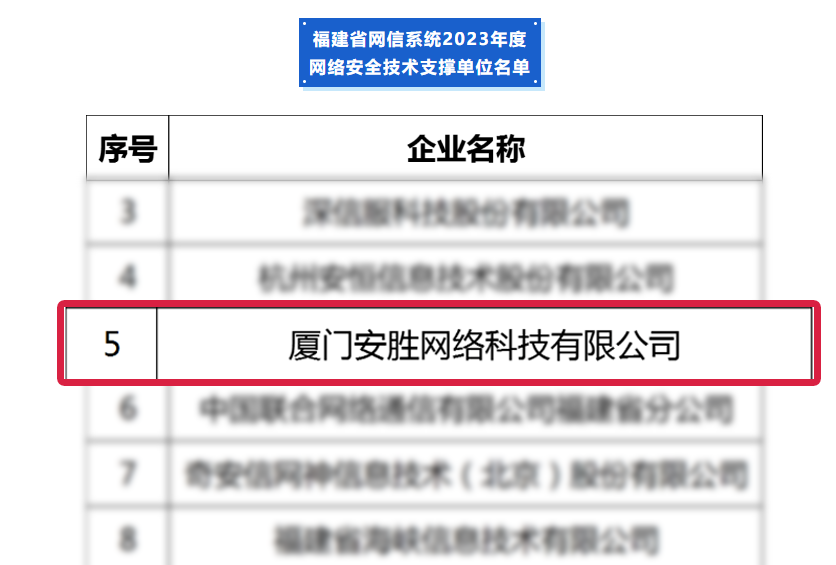 近日,福建省委网信办会同国家互联网应急中心福建分中心公示了福建省网信系统2023年度网络安全技术支撑单位名单,厦门安胜网络科技有限公司成功入选。