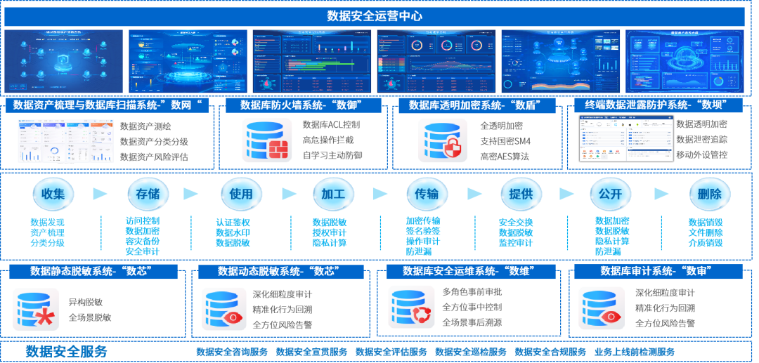 安胜的数据安全解决方案覆盖数据全生命周期,为客户提供多层次防御与智能化管理,提供包括数据分类分级、数据加密与脱敏、数据访问审计与监控、数据库防火墙与安全管控、威胁检测与应急响应等相关产品及服务,为企业搭建强大的数据安全体系,有效防范安全威胁和泄露风险。