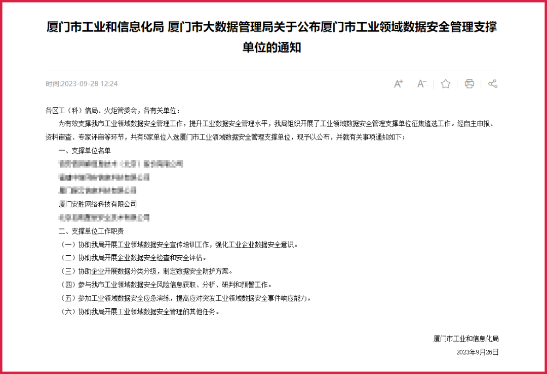 近日,为贯彻落实《工业和信息化领域数据安全管理办法(试行)》及福建省“数安护航·八闽行”专项行动等要求,经自主申报、资料审查、专家评审等环节,厦门安胜网络科技有限公司(以下简称:“安胜”)成功入选厦门市工业领域数据安全管理支撑单位。