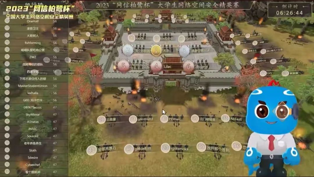 宣布开赛后,本次大赛出题组组长、厦门安胜网络科技有限公司安服中心负责人牛军为大家介绍了本次大赛的赛制规则及靶场。赛事靶场以古代战场攻城战斗为背景,通过可视化界面实时展示各战队的比赛情况。大赛采用国际上广泛流行的CTF模式,题目涉及Pwn、Web、MISC、Crypto、Reverse等方向。全国各地的大学生参赛选手们通过线上系统接入赛事靶场,对赛题进行解答,解答成功后夺得flag,展现了各个战队团结协作、顽强拼搏的精神风貌。