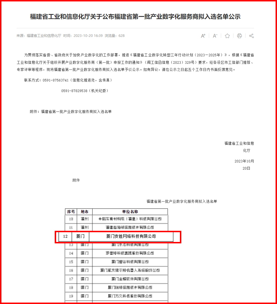 为贯彻落实省委、省政府关于加快产业数字化的工作部署,推进《福建省工业数字化转型三年行动计划(2023—2025年)》,10月20日,福建省工业和信息化厅公示了《福建省第一批产业数字化服务商拟入选名单》,厦门安胜网络科技有限公司凭借深厚的技术积累和实力成功入选!