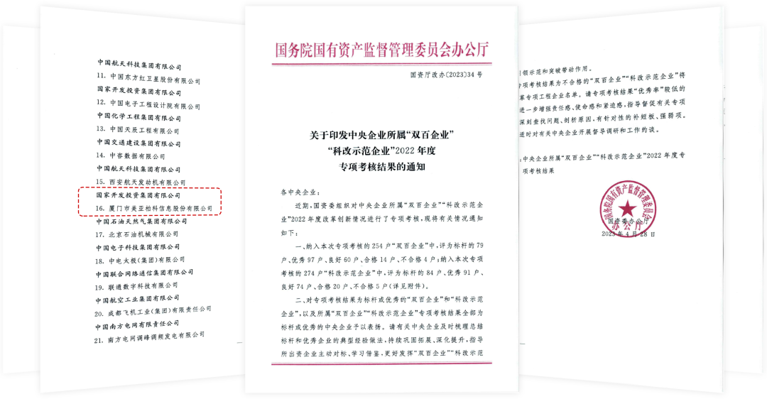 2023年5月,国务院国资委印发《关于印发中央企业所属“双百企业”、“科改示范企业”2022年度专项考核结果的通知》(国资厅改办〔2023〕34 号),此次考核共设标杆、优秀、良好、合格和不合格5个等级,国投智能(美亚柏科)获评2022年度“科改示范企业”标杆。