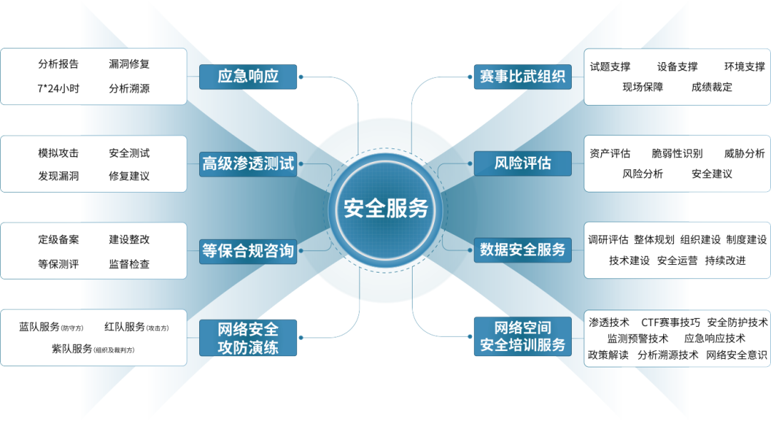 安胜拥有一支实战经验丰富的技术团队,能够提供高级渗透测试、网络安全攻防演练、数据安全服务、数据出海合规咨询服务、等保合规咨询、风险评估、应急响应、赛事比武、网络空间安全培训服务等安全服务。