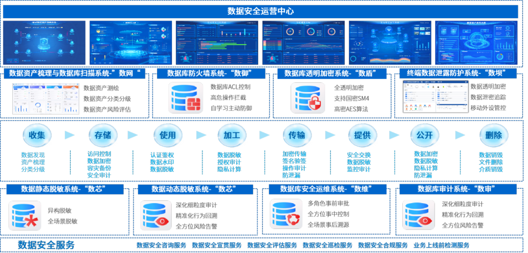 作为福建省第一批产业数字化服务商、厦门市工业领域数据安全管理支撑单位,安胜的数据安全解决方案以“服务+产品”的模式,为客户提供数据安全咨询、安全建设和安全运营解决方案。该方案覆盖数据全生命周期,为客户提供多层次防御与智能化管理,提供包括数据分类分级、数据加密与脱敏、数据访问审计与监控、数据库防火墙与安全管控、威胁检测与应急响应等相关产品及服务,为企业搭建强大的数据安全体系,有效防范安全威胁和泄露风险。
