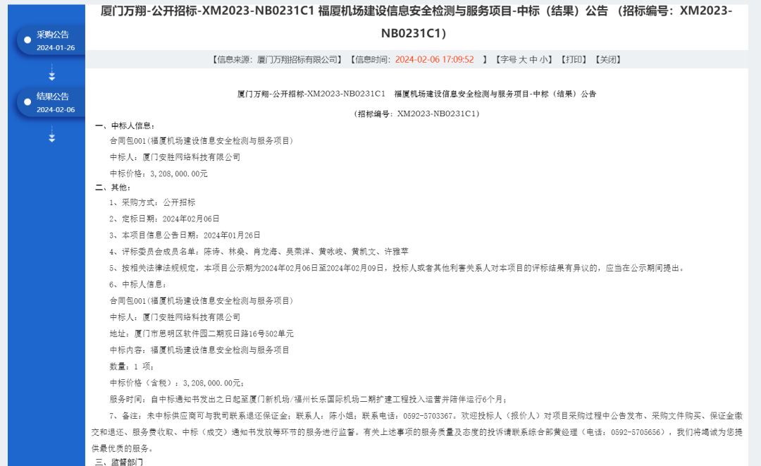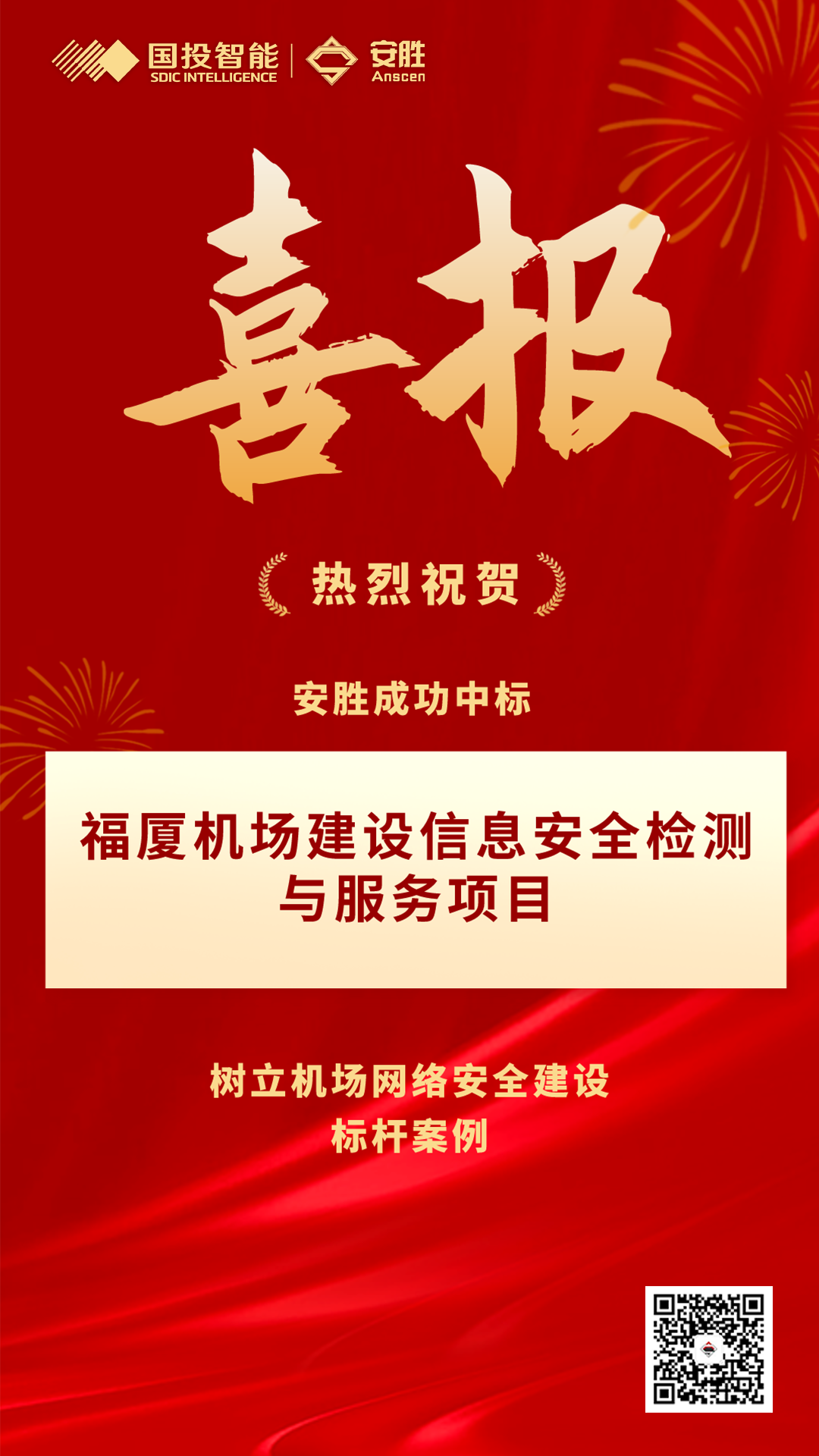安胜作为网络空间安全和大数据智能化综合解决方案提供商,依托多年行业深耕经验、突出的综合实力和技术水平,在众多竞争单位中脱颖而出,成功中标福厦机场建设信息安全检测与服务项目。