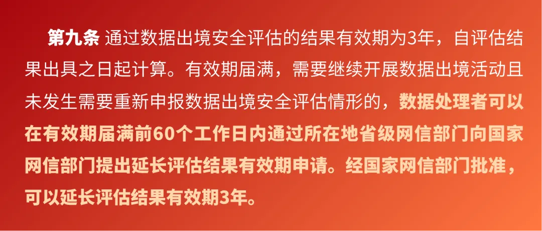五是,延长数据出境安全评估结果有效期,增加数据处理者可以申请延长评估结果有效期的规定。