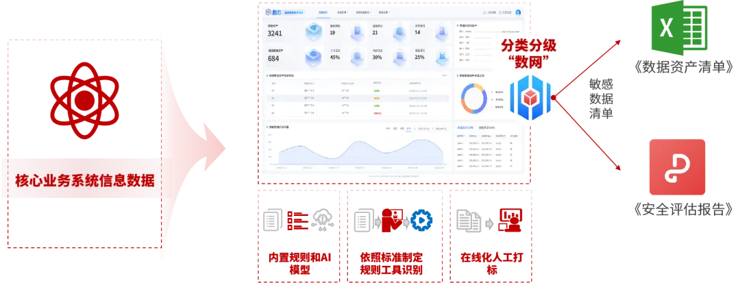 “数网”作为数据分类分级安全治理工具在数据出境前为企业提供智能化数据资产扫描、数据分类分级等;并通过脆弱性、威胁评估等提供数据安全保障稽查;根据梳理与评估结果,结合数据脱敏与加密、数据访问审计、数据库防火墙等相关数据安全防护产品,可为数据出境安全审查提供有力的技术支撑。