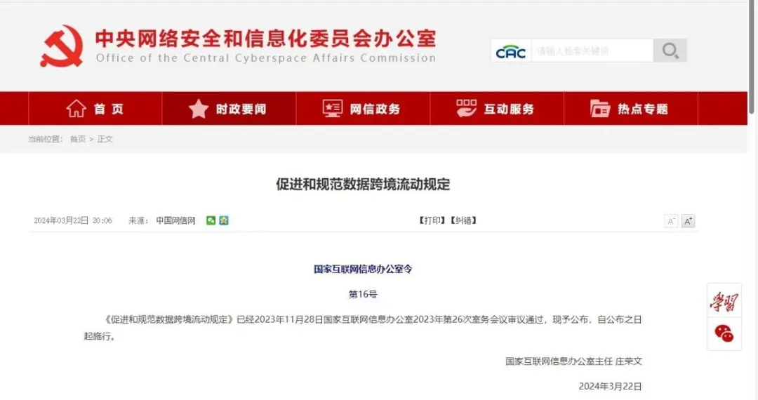 近日,国家互联网信息办公室公布《促进和规范数据跨境流动规定》(以下简称《规定》),对现有数据出境安全评估、个人信息出境标准合同、个人信息保护认证等数据出境制度的实施和衔接作出进一步明确,适当放宽数据跨境流动条件,适度收窄数据出境安全评估范围,在保障国家数据安全的前提下,便利数据跨境流动,降低企业合规成本,充分释放数据要素价值,扩大高水平对外开放,为数字经济高质量发展提供法律保障。