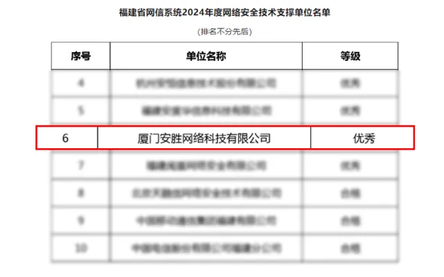 近日,福建省委网信办会同国家互联网应急中心福建分中心确定了福建省网信系统2024年度网络安全技术支撑单位名单,厦门安胜网络科技有限公司(以下简称:安胜)凭借在网络安全、数据安全领域的专业实力再次成功入选,并被评为优秀!
