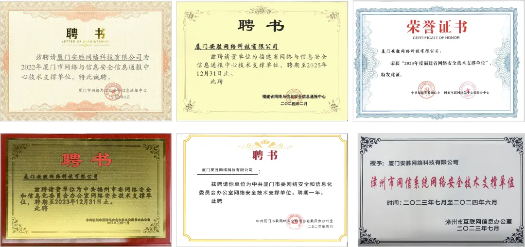 作为网络空间安全和大数据智能化综合解决方案提供商,安胜已先后多次入选福建省网络与信息安全信息通报中心技术支撑单位、福建省通信管理局网络数据安全技术支撑单位、福州市/厦门市/漳州市网络安全技术支撑单位、厦门市工业领域数据安全管理支撑单位、厦门市网络与信息安全信息通报中心技术支撑单位等,是国家级网络安全保障任务的重要支撑力量。