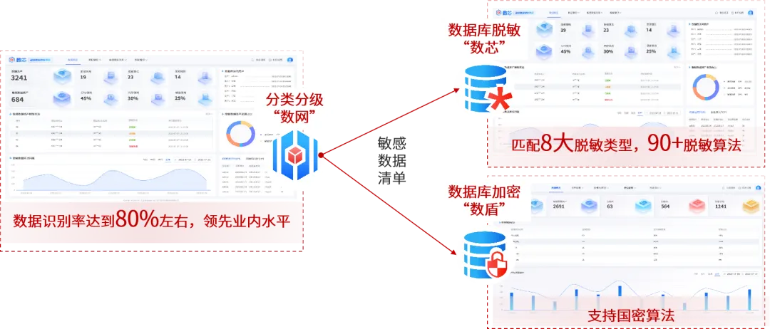 建设数据安全防护体系,制定资产分类分级标准、建设组织&制度,并通过“数网”数据资产梳理与数据库扫描系统梳理数据资产台账,对数据资产分类分级,应用“数芯”数据动态脱敏系统、“数盾”数据库加密系统进行敏感数据的脱敏、加密防护,构建数据安全防护方案。