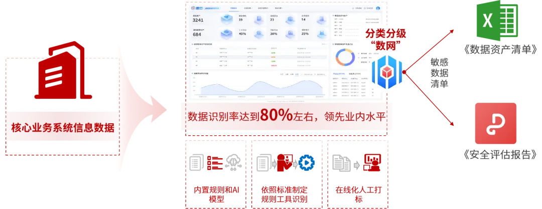 对核心业务系统信息数据进行数据分类分级,制定资产分类分级标准,并通过“数网”数据资产梳理与数据库扫描系统梳理核心数据资产清单,对于重要核心数据、敏感数据做特定标识,对于系统的数据安全做出评估。
