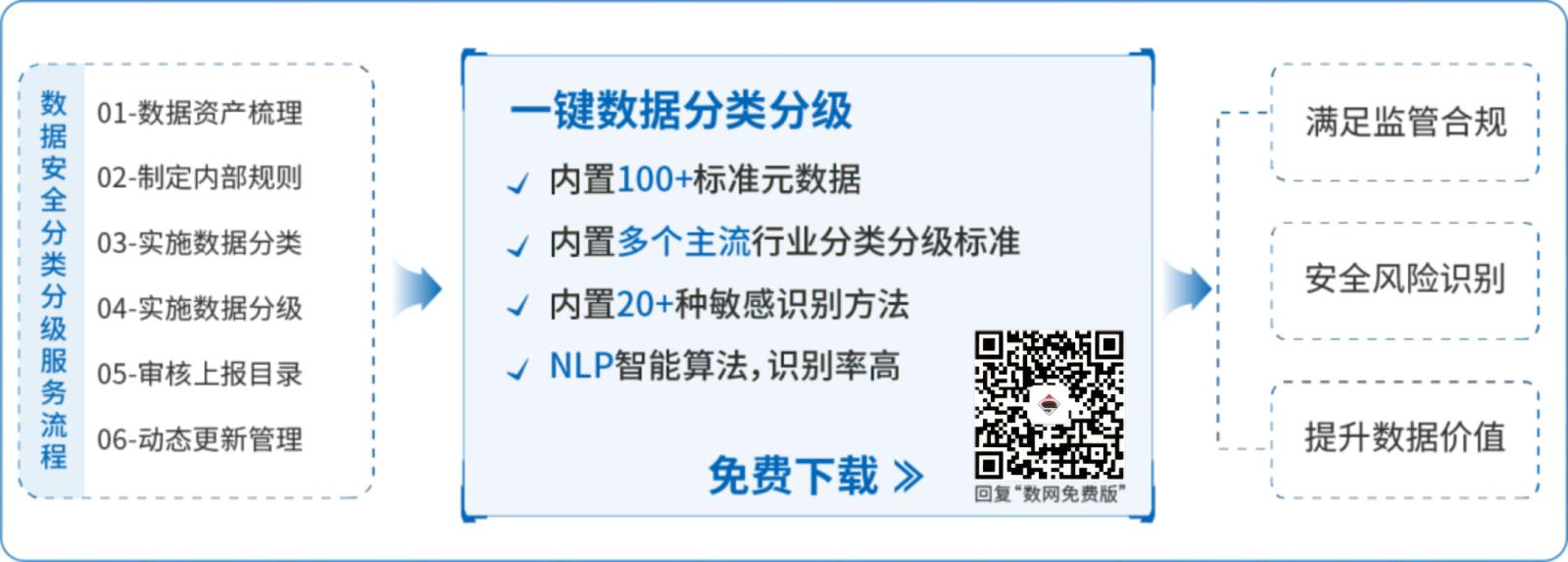 目前,安胜推出了“数网”数据资产梳理与数据库扫描系统的免费版——“数网”数据分类分级工具。