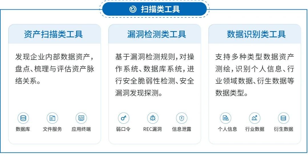 在数据安全风险评估的实践中,安胜提供不同的风险评估工具——扫描类工具(资产扫描类、漏洞检测类、数据识别类)和自动化工具(风险评估表、在线评估工具),可满足企业特定业务需求和安全环境: