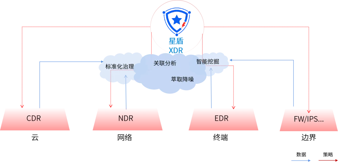“星盾”多源威胁检测响应平台是一款基于“云、网、边、端”多源安全大数据的威胁检测与响应(XDR)平台,可实现跨边界、跨区域、跨设备的全方位安全检测和响应。具备统一的数据治理、关联分析、告警降噪、联动封堵、行为画像、溯源取证等能力,以全局的视角进行安全分析研判、自动响应,从而实现企业网络空间安全的高效运营。