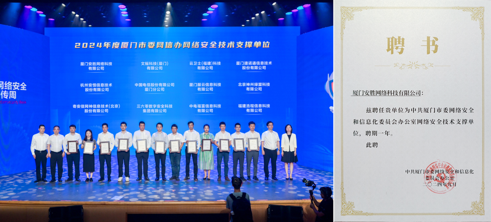 9月12日下午,由厦门市委宣传部、厦门市委网信办、厦门市教育局、厦门市公安局等15家单位联合主办的厦门市第六届网络安全宣传周正式启动。在开幕仪式上,安胜再次入选了“2024年度厦门市委网信办网络安全技术支撑单位”。