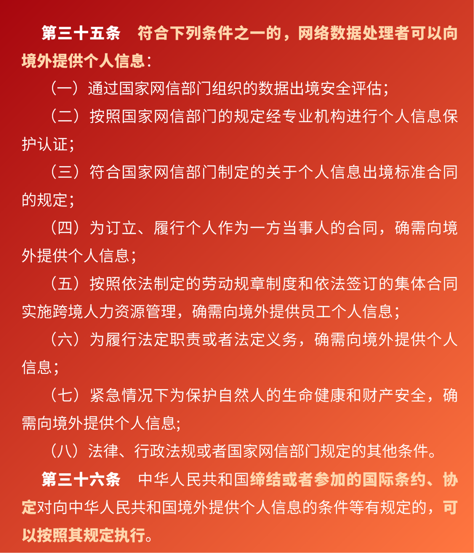 明确网络数据处理者可以向境外提供个人信息的条件,规定可以按照缔结或者参加的国际条约、协定向境外提供个人信息。