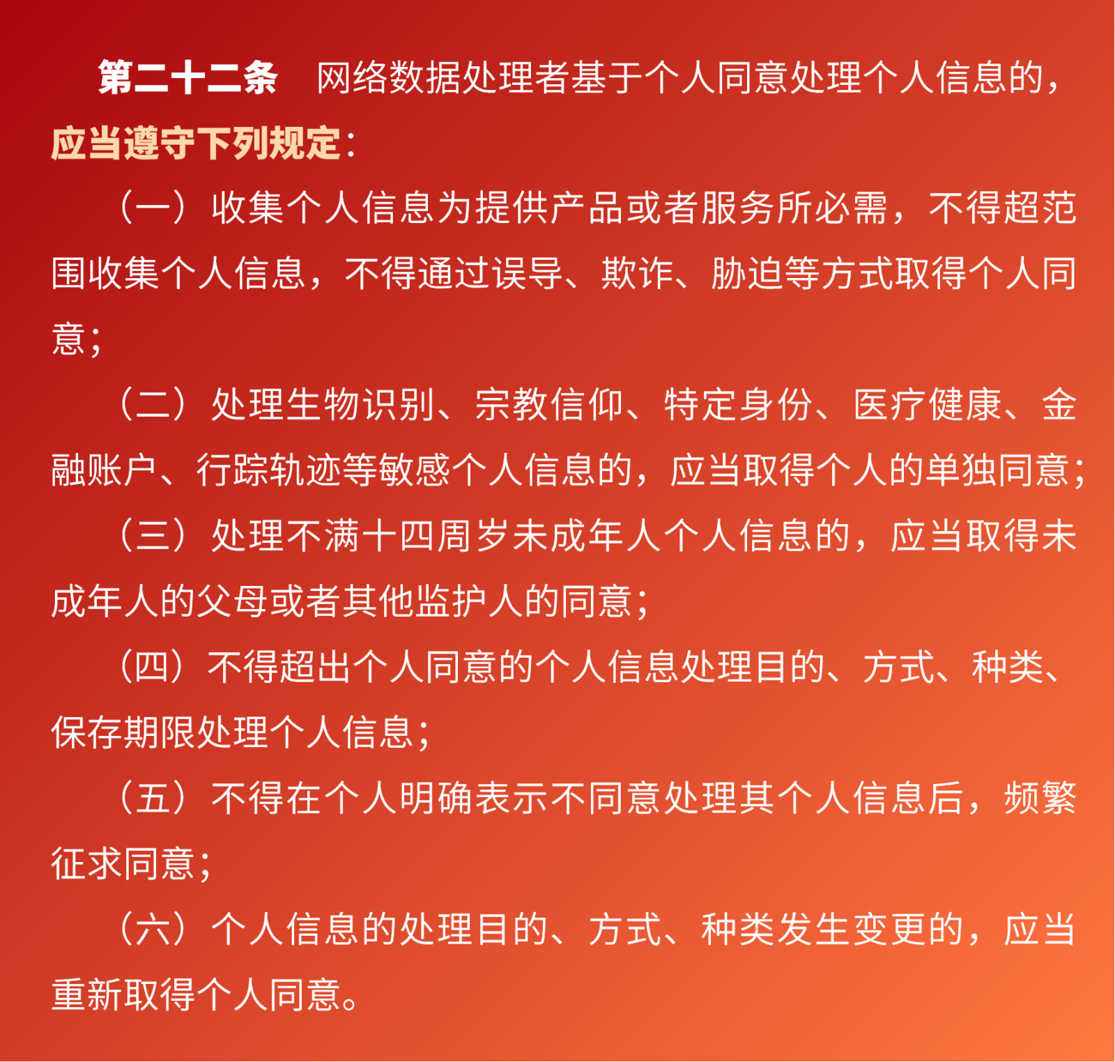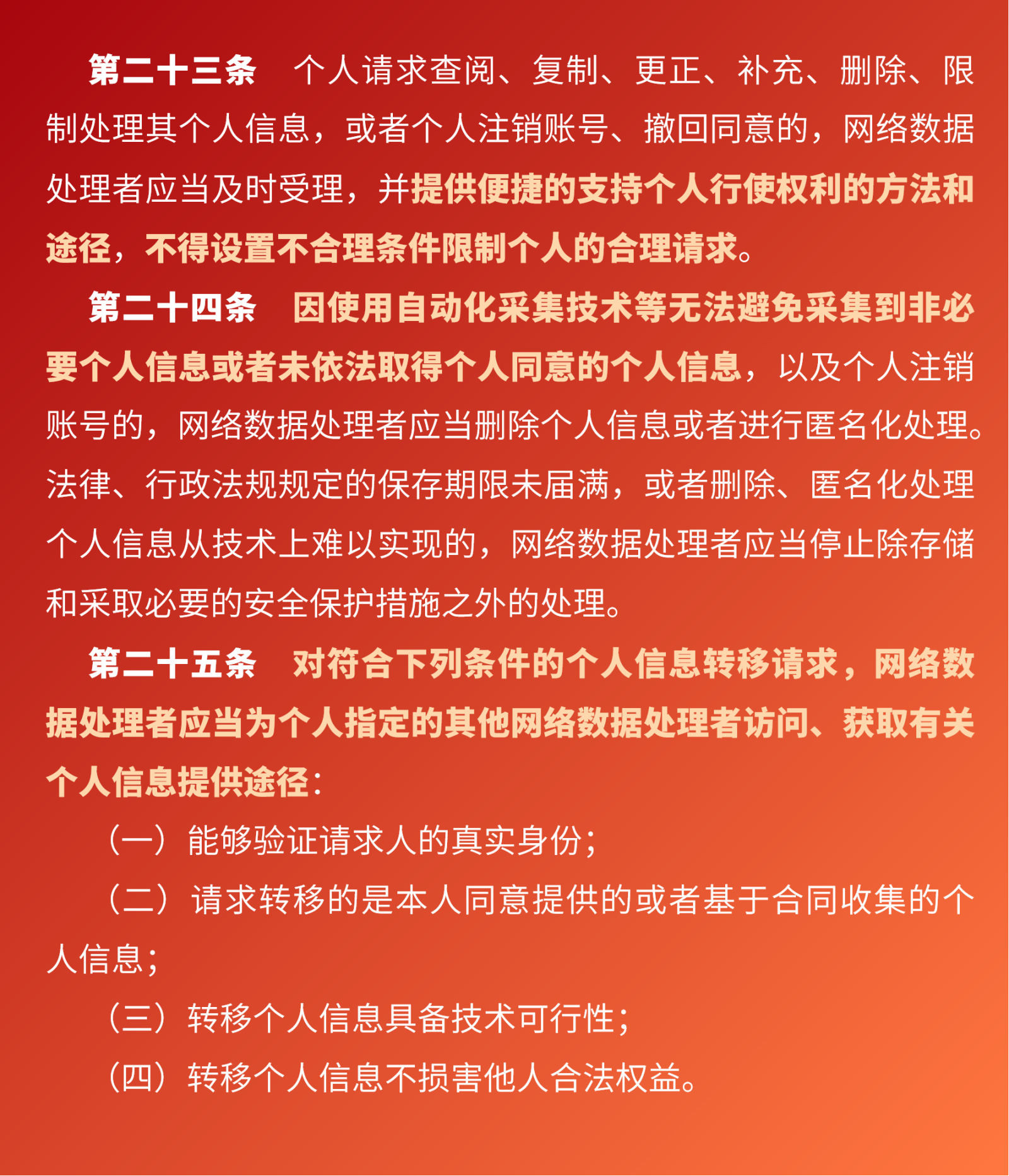 要求网络数据处理者提供便捷的支持个人行使权利的方法和途径,不得设置不合理条件限制个人的合理请求。明确使用自动化采集技术等采集个人信息的保护义务,细化个人信息转移请求实现途径等。