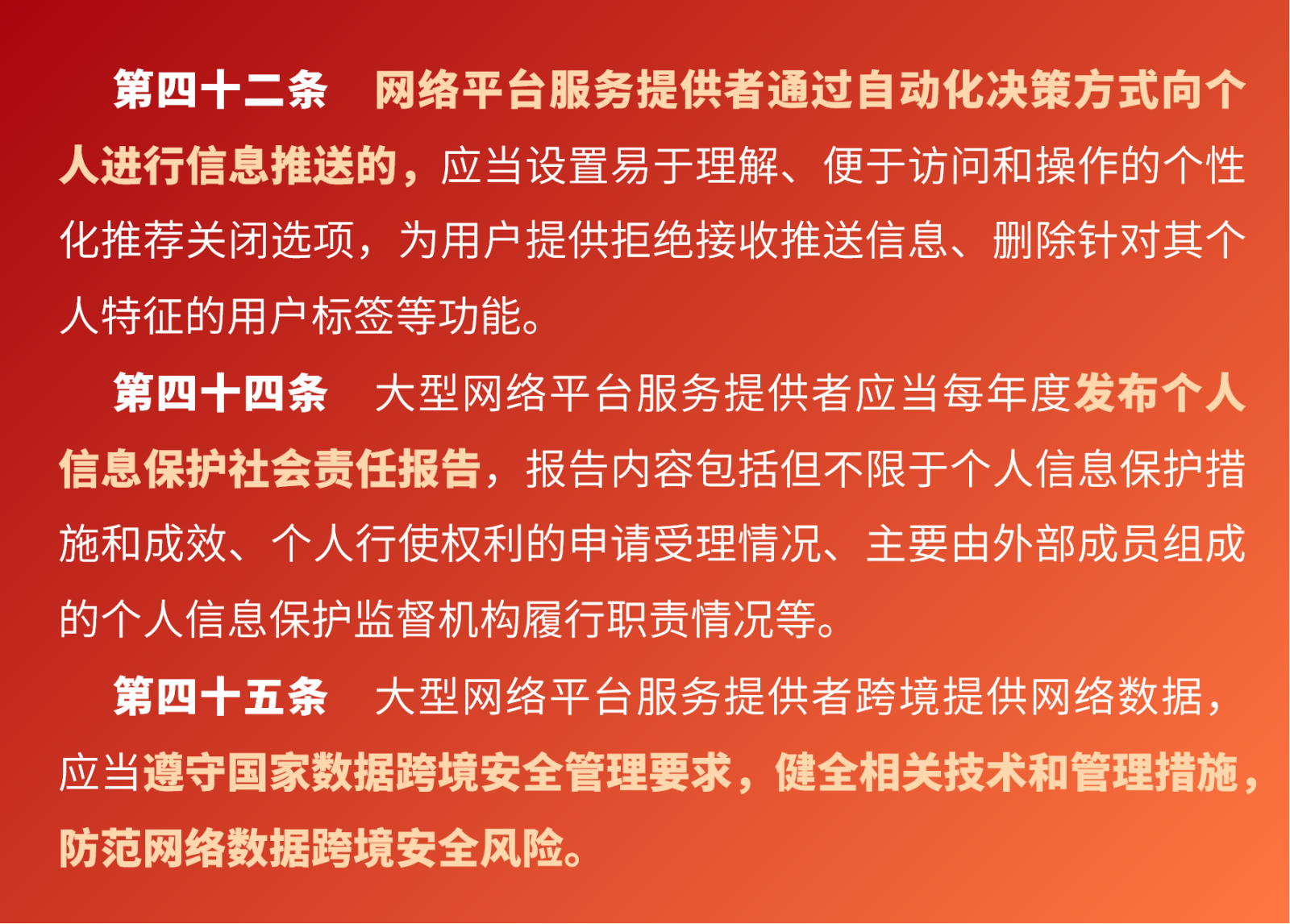 明确通过自动化决策方式向个人进行信息推送的规则,规定大型网络平台服务提供者发布个人信息保护社会责任年度报告、防范网络数据跨境安全风险等要求。