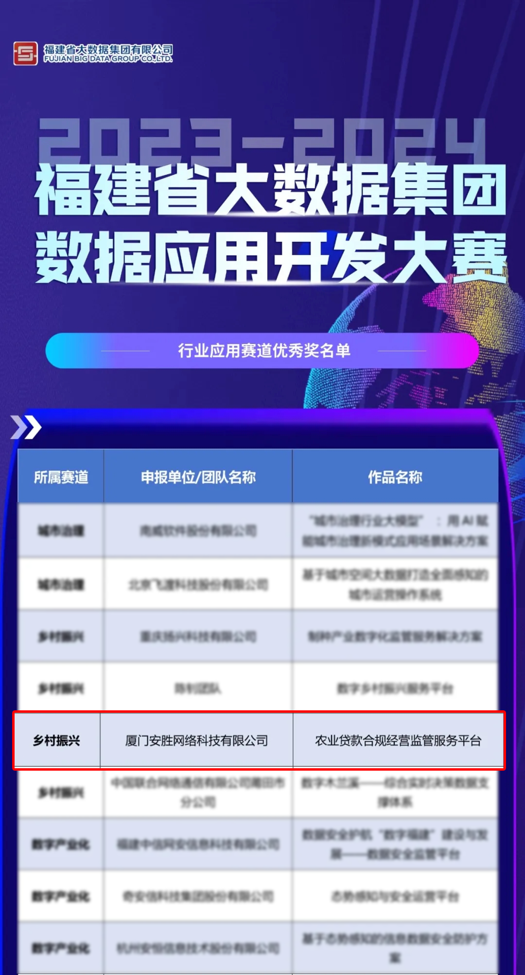 近日,2023-2024年福建省大数据集团数据应用开发大赛正式公布行业应用赛道优秀奖名单。厦门安胜网络科技有限公司凭借“农业贷款合规经营监管服务平台”数据应用开发产品成功入选乡村振兴赛道优秀奖!