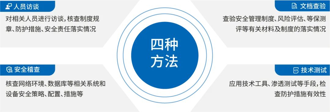 通过人员访谈、文档查验、安全稽查、技术测试等4个评估手段识别可能存在的数据安全风险隐患。