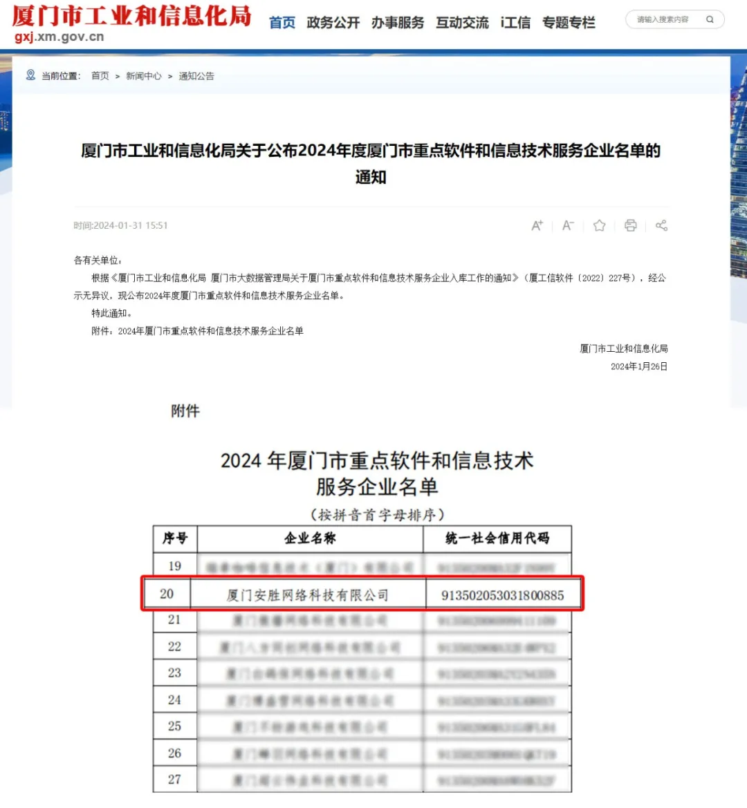 安胜已连续连续三年入选厦门市工业和信息化局《2024年度厦门市重点软件和信息技术服务企业名单》,充分彰显相关部门对公司科技创新能力、核心技术优势以及广阔市场前景等多方面硬实力的高度认可。