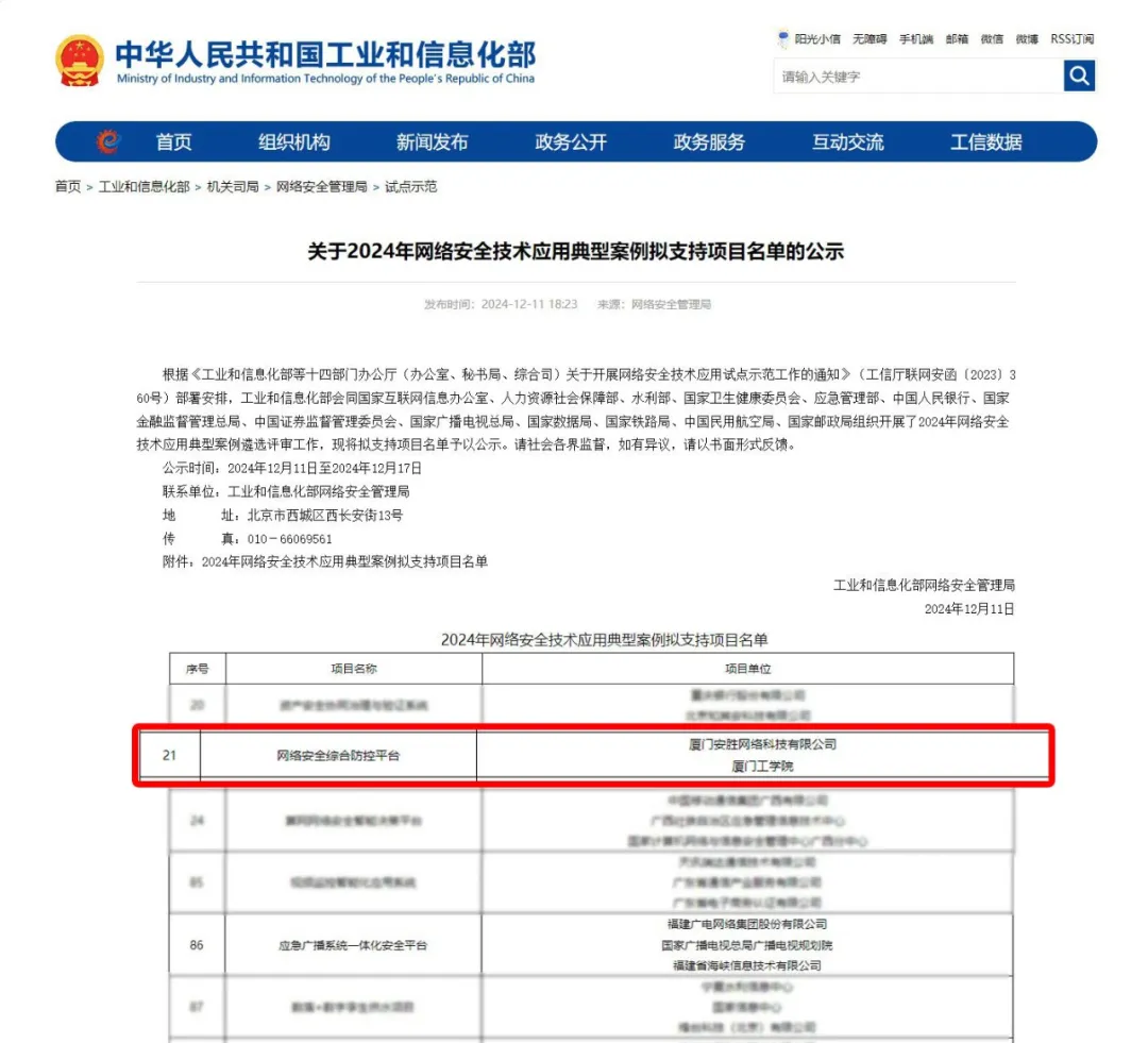 安胜联合厦门工学院申报的“网络安全综合防控平台”项目,经市、省层层筛选推荐,从全国上千个重点项目中脱颖而出,入选2024年网络安全技术应用典型案例,是福建省入选的两个国家级试点示范项目之一。