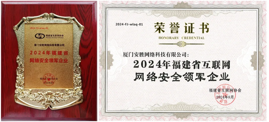 安胜在网络安全领域精耕细作,凭借着领先的综合实力和业务水平,荣获“2024年福建省网络安全领军企业”称号,成为本年度仅有的五家获奖企业之一。