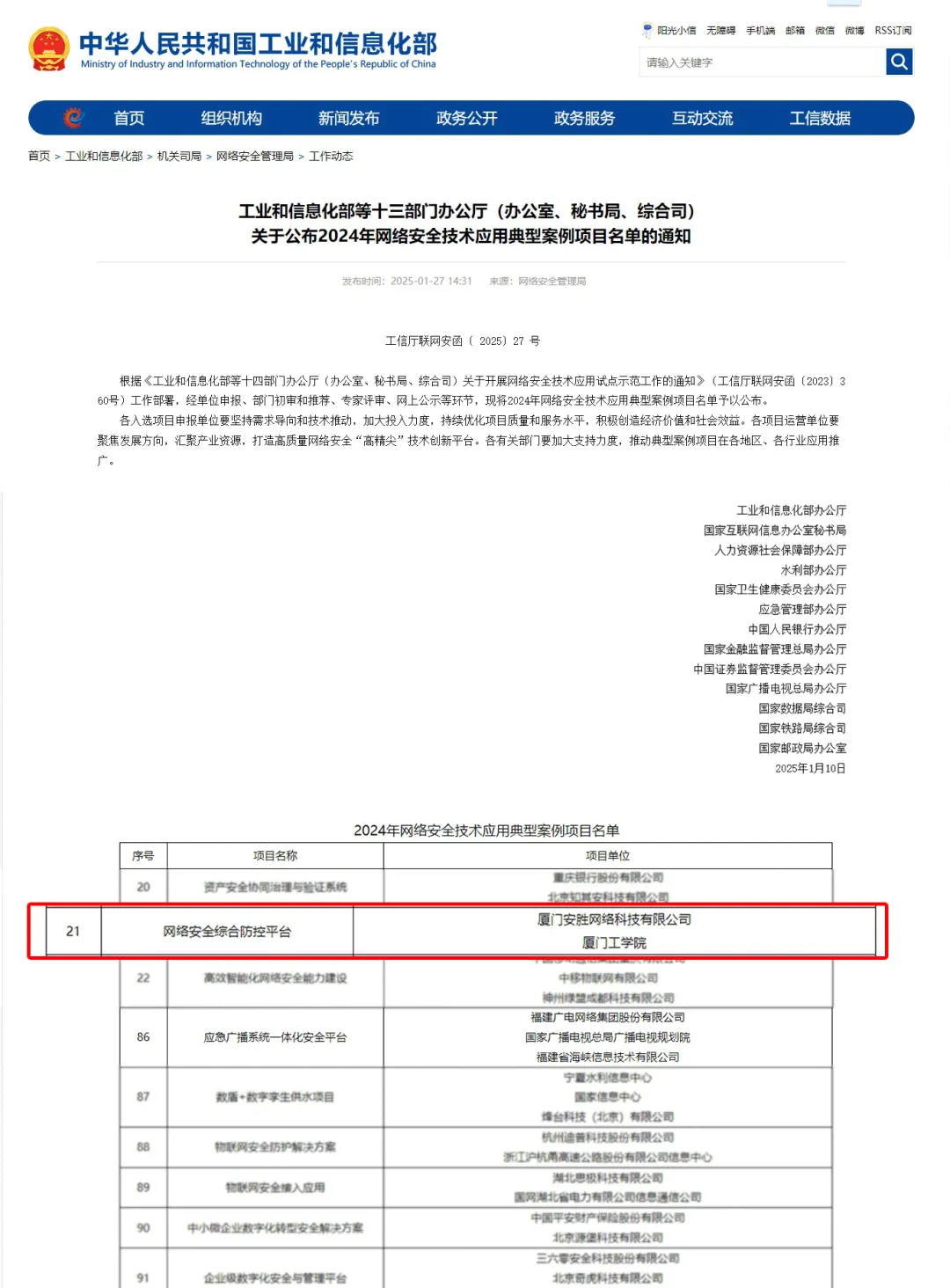 近日,工业和信息化部官网正式公布了《工业和信息化部等十三部门办公厅(办公室、秘书局、综合司)关于公布2024年网络安全技术应用典型案例项目名单的通知》。其中,安胜联合厦门工学院申报的“网络安全综合防控平台”项目,经市、省层层筛选推荐,从全国上千个重点项目中脱颖而出,入选2024年网络安全技术应用典型案例项目,是福建省入选的两个国家级试点示范项目之一。