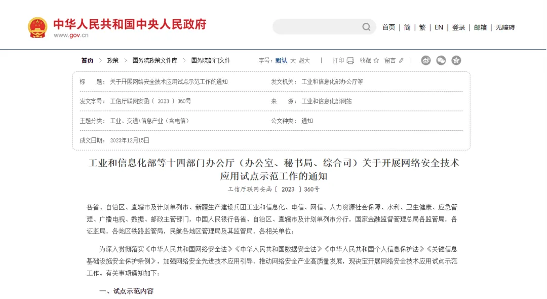本次评审是根据《工业和信息化部等十四部门办公厅(办公室、秘书局、综合司)关于开展网络安全技术应用试点示范工作的通知》(工信厅联网安函〔2023〕360号)工作部署,经单位申报、部门初审和推荐、专家评审、网上公示等环节,属于高规格、强阵容的国家级评审。此次入选不仅充分展示公司的技术创新与产品实力,也彰显公司在业界突出的竞争力和影响力。