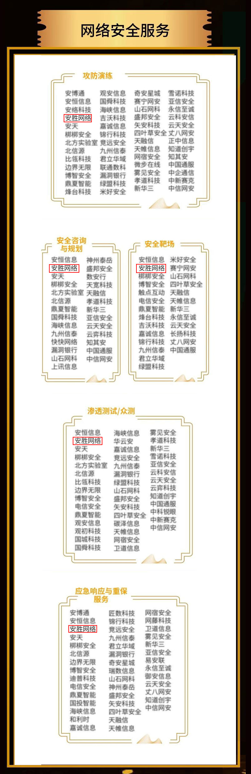 安胜拥有一支在行业深耕多年和实战经验丰富的安全团队,能够提供网络安全与数据安全服务。主要涵盖渗透测试、攻防演练、等保合规咨询、风险评估、应急响应、赛事比武、分类分级、数据出境、安全培训服务等安全服务。团队曾多次参与承接国家级网络安全保障任务,如全国两会、杭州G20峰会、党的十九大、党的二十大、厦门金砖会晤、青岛“上合峰会”、北京冬奥会、杭州亚运会等,均获得高度肯定。