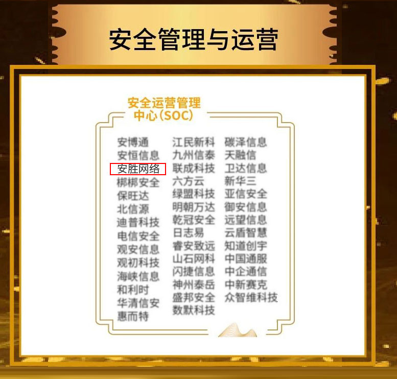近日,安全牛正式发布《中国网络安全行业全景图(第十二版)》,安胜成功入选安全运营管理中心(SOC)、终端安全防护、数据安全评估和检查、数据防泄漏、数据分类分级、攻防演练、渗透测试、应急响应等多个细分领域。