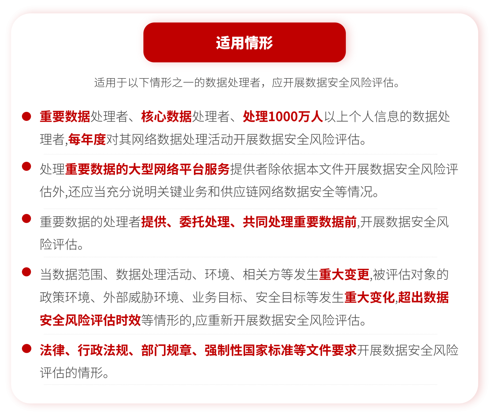 数据安全风险评估,主要围绕数据和数据处理活动,聚焦可能影响数据的保密性、完整性、可用性和数据处理活动合理性的安全风险,掌握数据安全总体状况,发现数据安全隐患,提出数据安全管理和技术防护措施建议,提升数据安全防攻击、防破坏、防窃取、防泄露、防滥用能力。