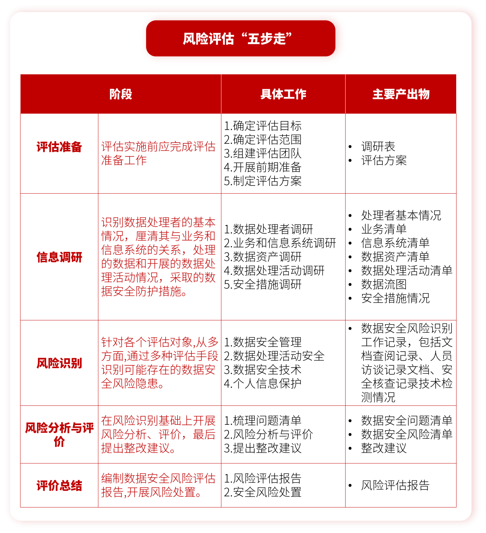 数据安全风险评估流程,主要包括评估准备、信息调研、风险识别、风险分析与评价、评估总结五个阶段。