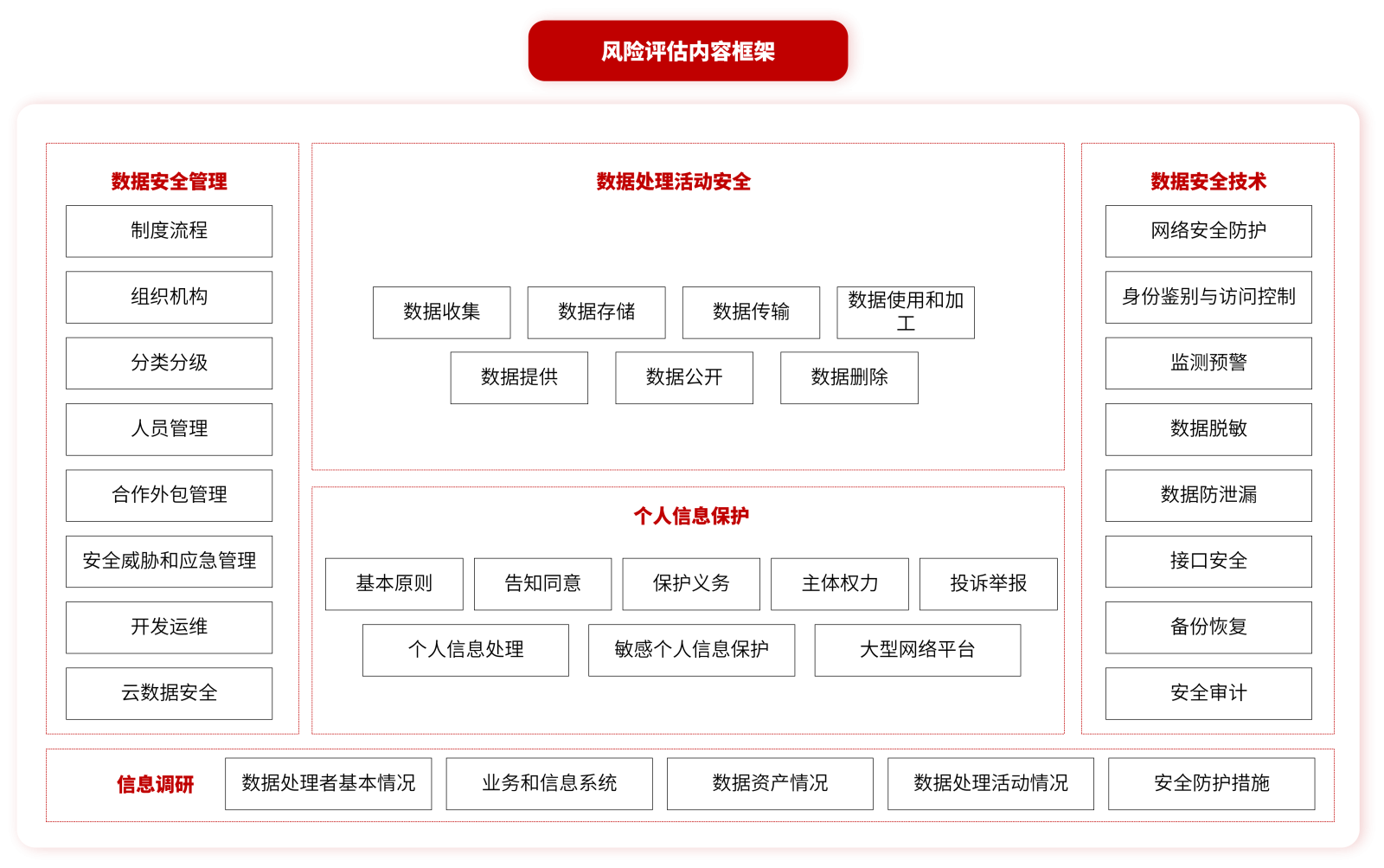 数据安全风险评估,在信息调研基础上,围绕数据安全管理、数据处理活动安全、数据安全技术、个人信息保护等方面开展评估。