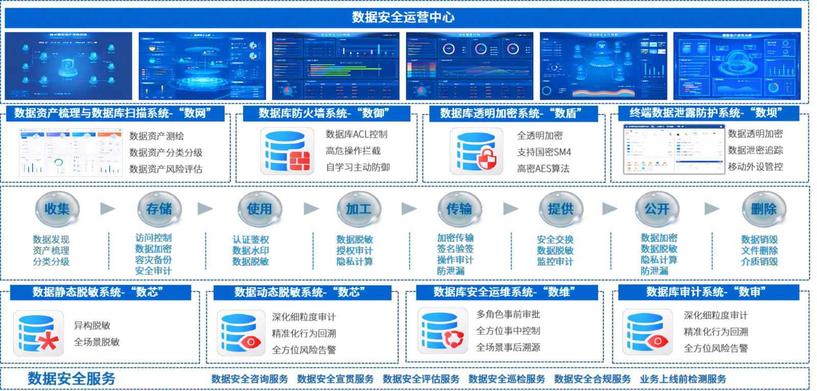 安胜提供包括数据分类分级(“数网”数据资产梳理与数据库扫描系统)、数据加密与脱敏(“数盾”数据库加密系统,“数芯”数据动态/静态脱敏系统)、数据访问审计与监控(“数审”数据库审计系统)、数据库防火墙与安全管控(“数御”数据库防火墙系统、“数坝”终端数据泄漏防护系统)、威胁检测与应急响应等相关产品,为企业强化数据安全技术防护体系,有效防范安全威胁和泄露风险。