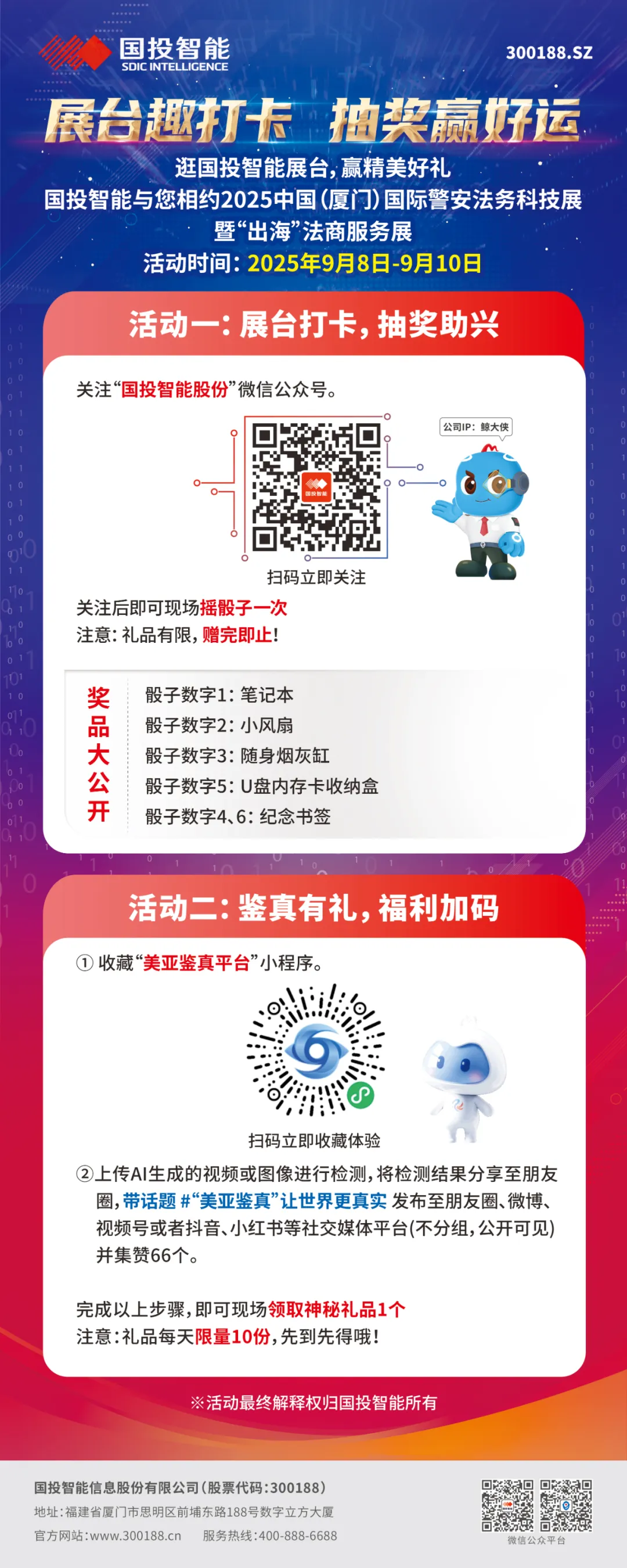 9月8日至11日,第二十五届中国国际投资贸易投洽会将在厦门举行。本届投洽会以“携手中国 投资未来”为主题,聚焦“投资中国”“中国投资”“国际投资”三大板块,设立了约12万平方米展区,将举办70多场投资专题活动和100多场专题路演。国投智能将在国际警安法务科技专区暨“出海”法商服务专区、国际投资服务专区、省市推介专区与供应链人工智能创新馆中展示前沿科技产品,一文速览,期待与您一起相约九八!