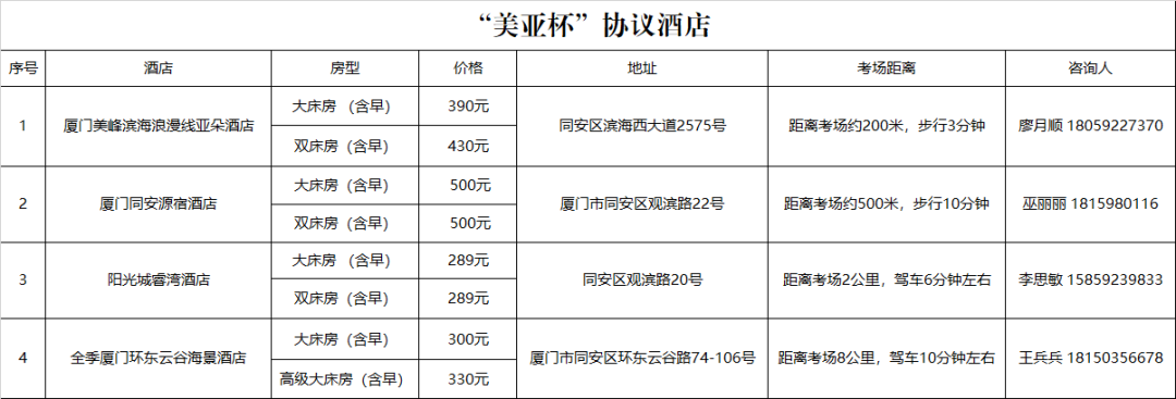 本次大赛为您推荐以下酒店,预订时说明“美亚杯”即可尊享专属优惠价格。