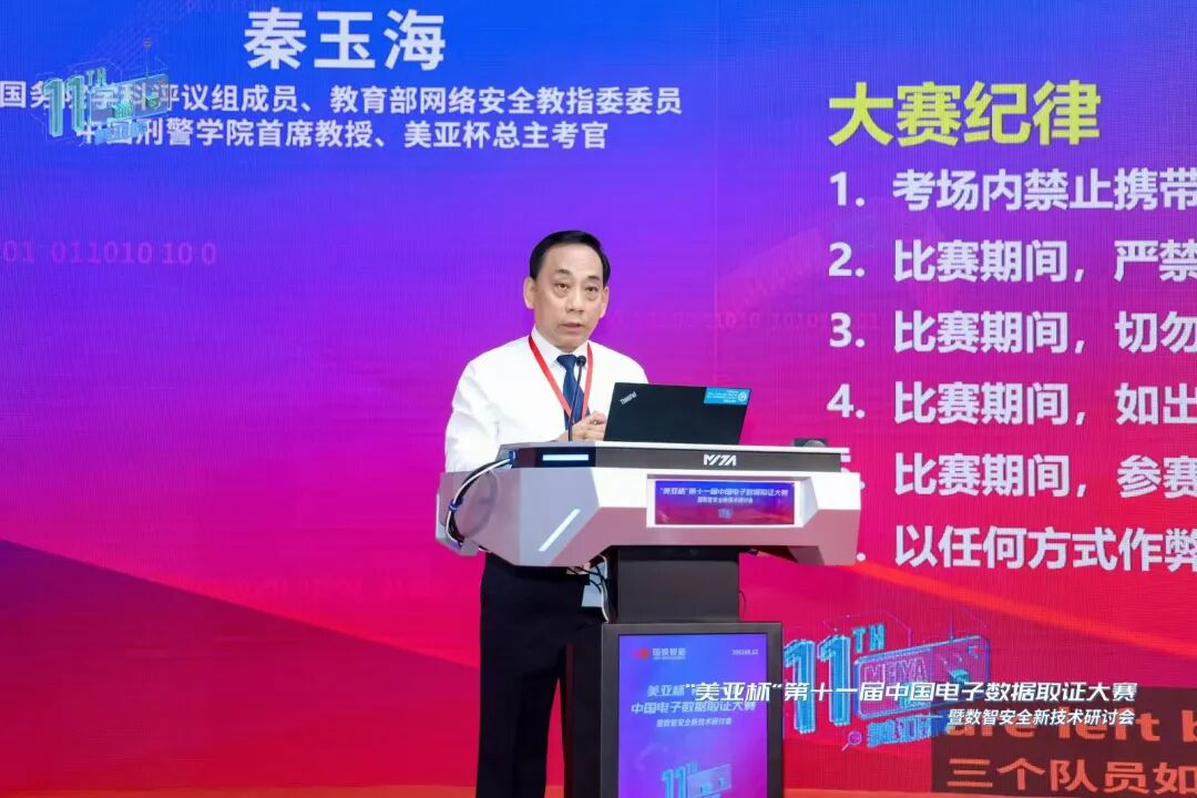 国务院学科评议组成员、教育部网络安全教指委委员、中国刑警学院首席教授、美亚杯总主考官秦玉海讲解赛制并宣布开赛。中国刑事警察学院武傲雪代表参赛选手宣誓。