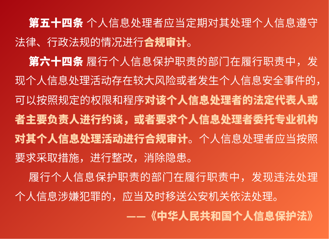 除了企业自主开展合规审计,政策上也明确了企业可以按照履行个人信息保护职责的部门要求,委托专业机构开展合规审计。