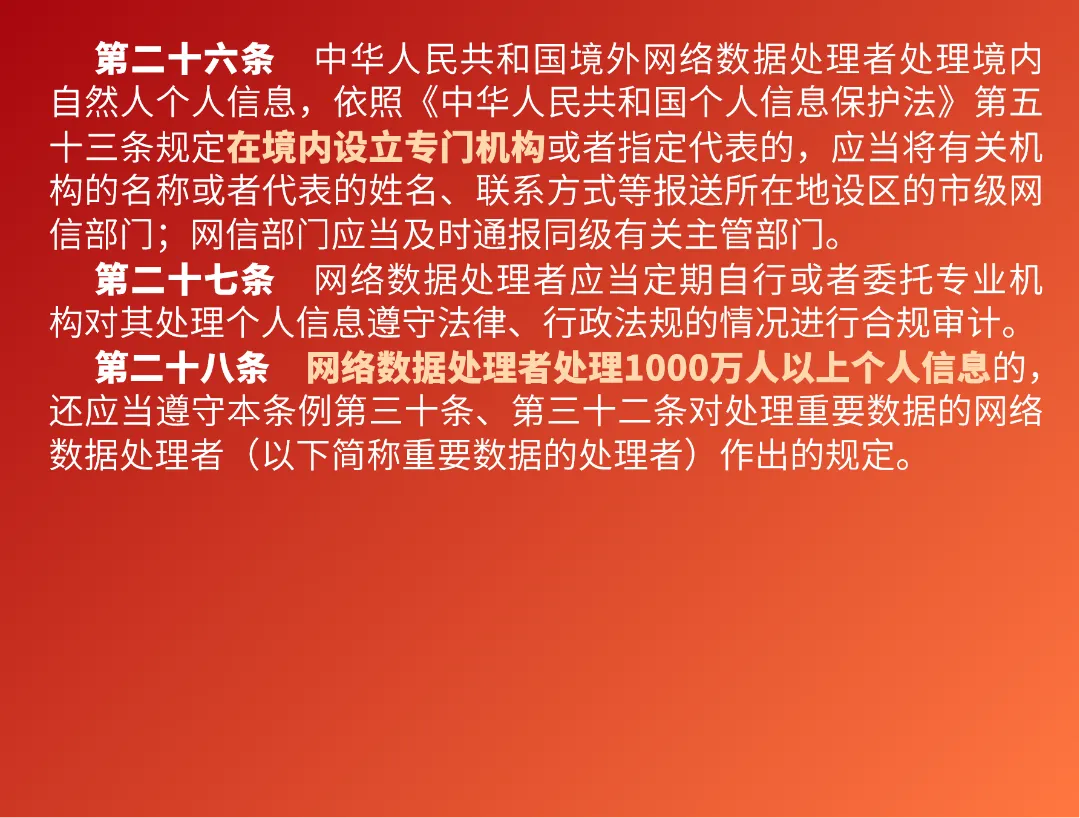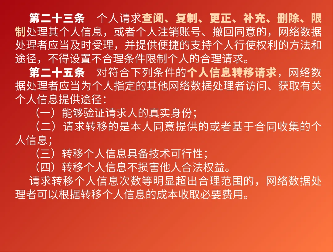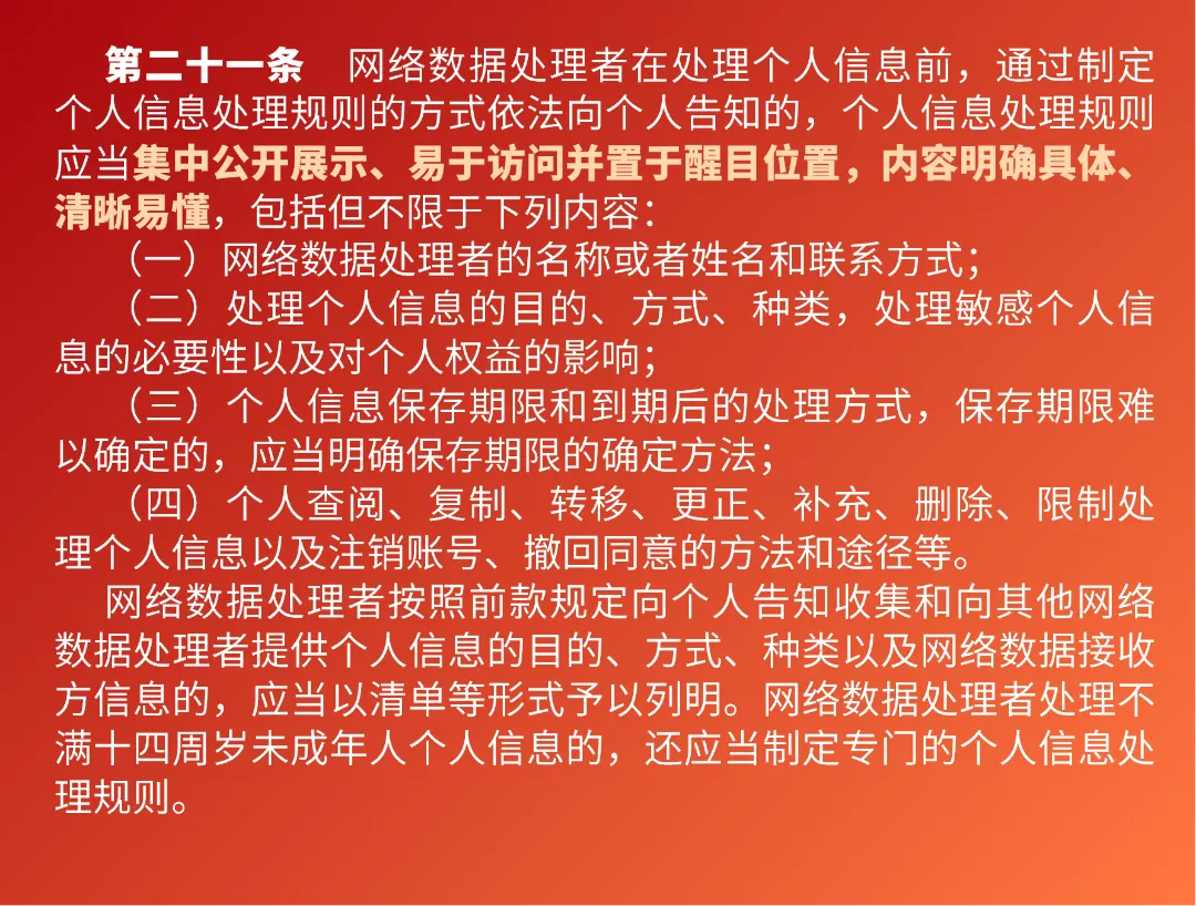 一是明确通过制定个人信息处理规则履行告知义务的内容、形式等要求。二是明确基于个人同意处理个人信息应当遵守的基本要求。三是明确行使个人信息查阅、复制、更正、补充、删除等权利的要求,细化个人信息转移的具体条件。四是明确按照《中华人民共和国个人信息保护法》第五十三条规定在境内设立专门机构或者指定代表的要求。五是明确网络数据处理者处理1000万人以上个人信息还应当履行的义务。https://www.gov.cn/zhengce/202409/content_6977835.htm
